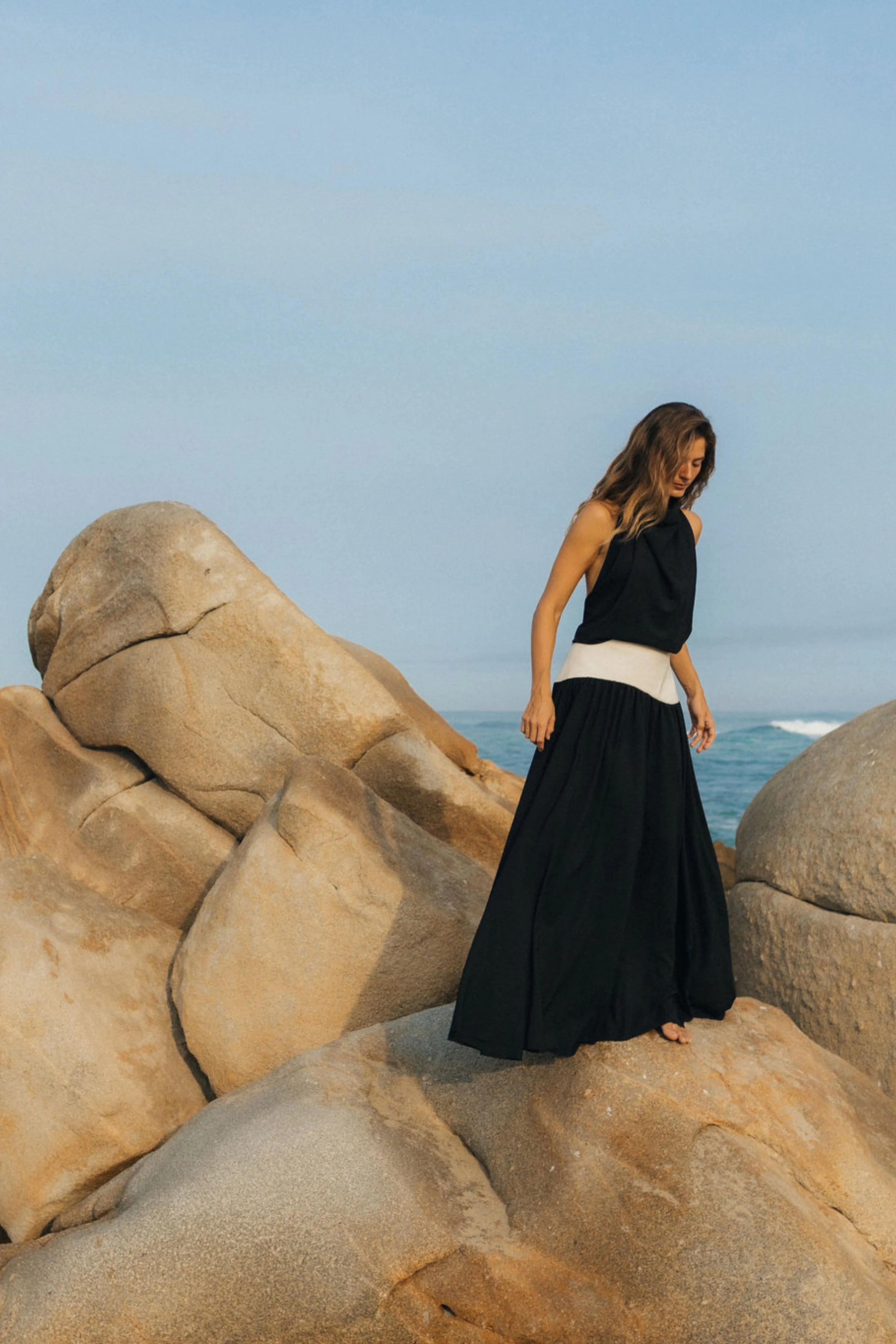 - Flowing full-length skirt