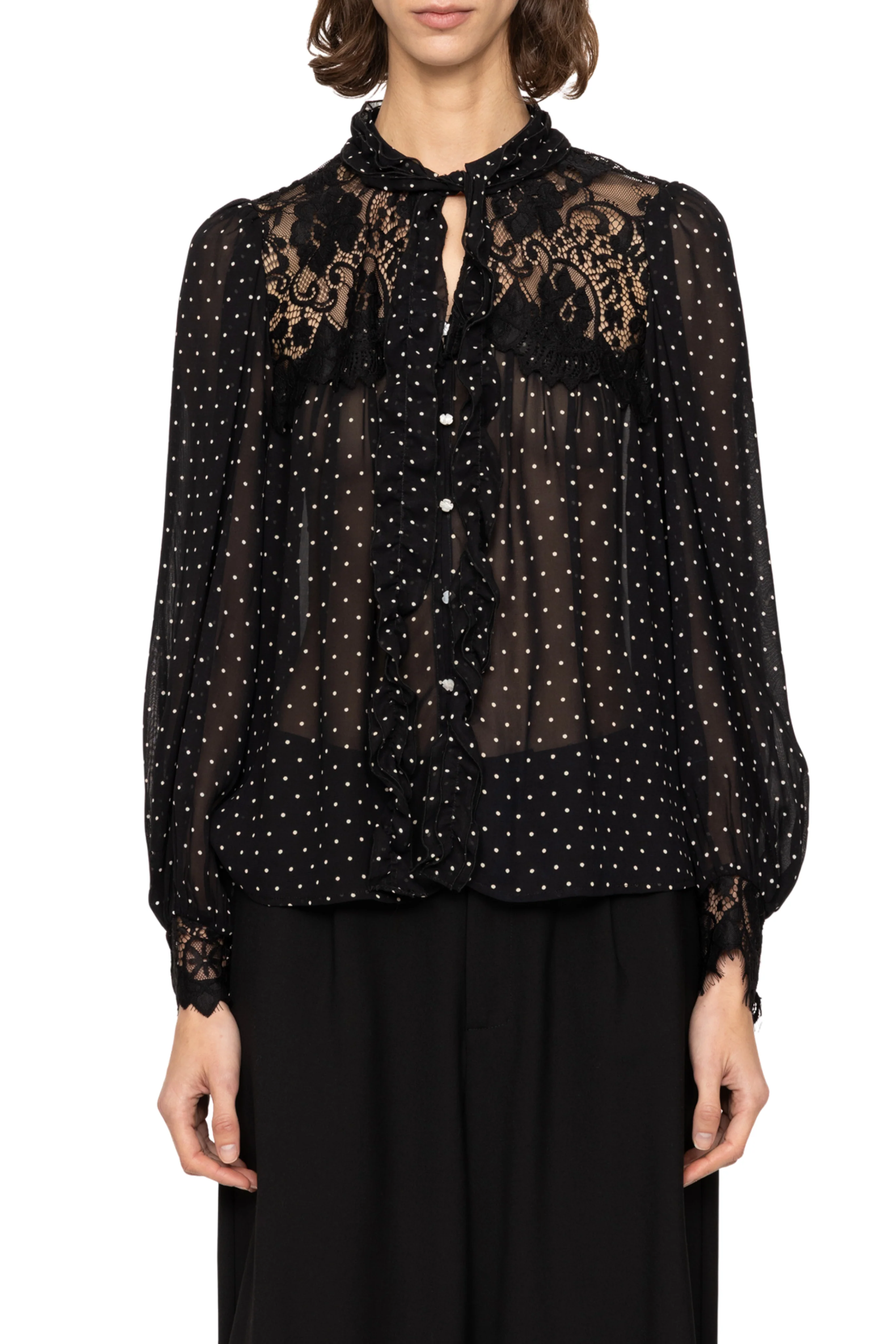 - Delicate sheer black fabric with dot print